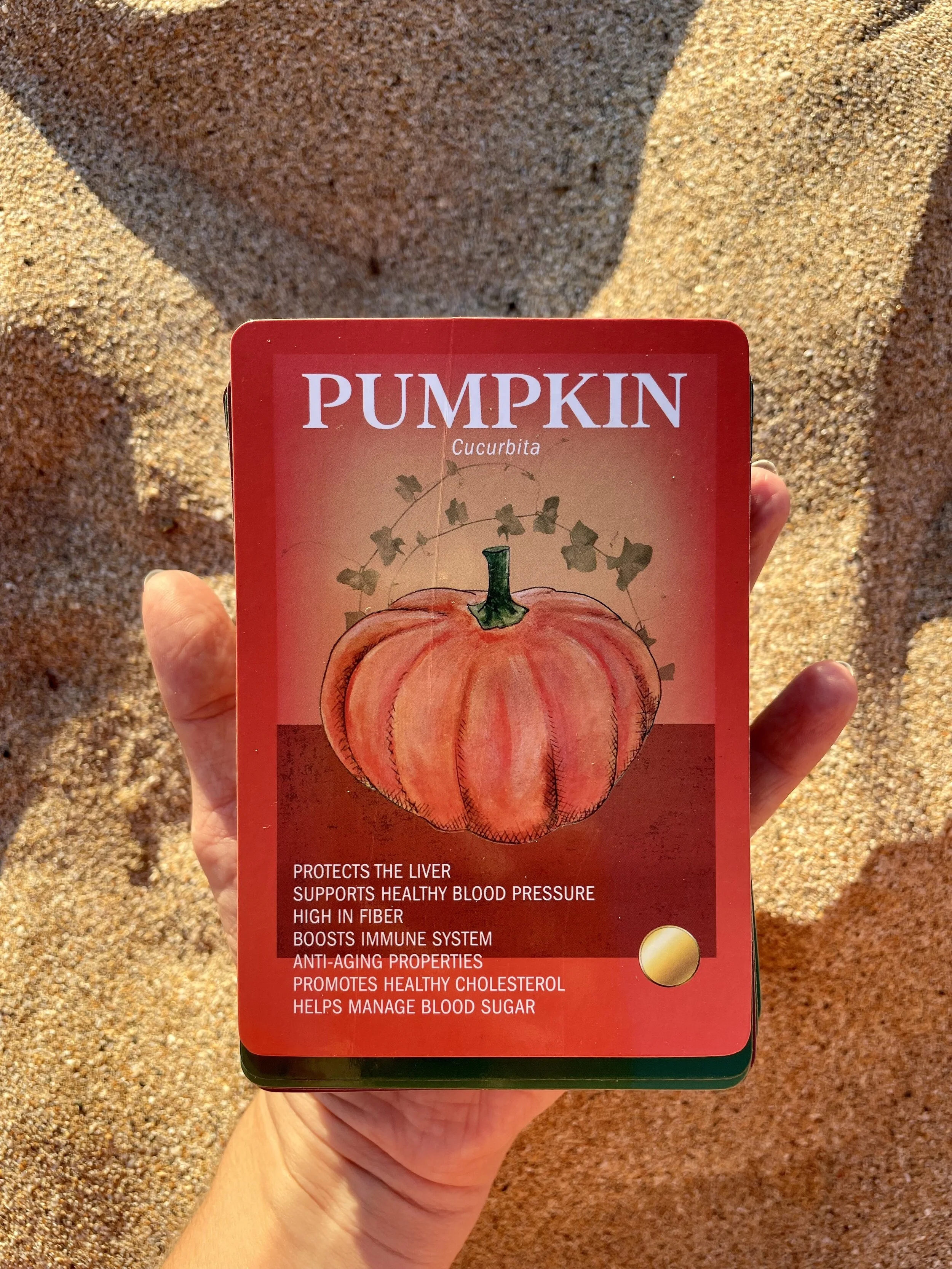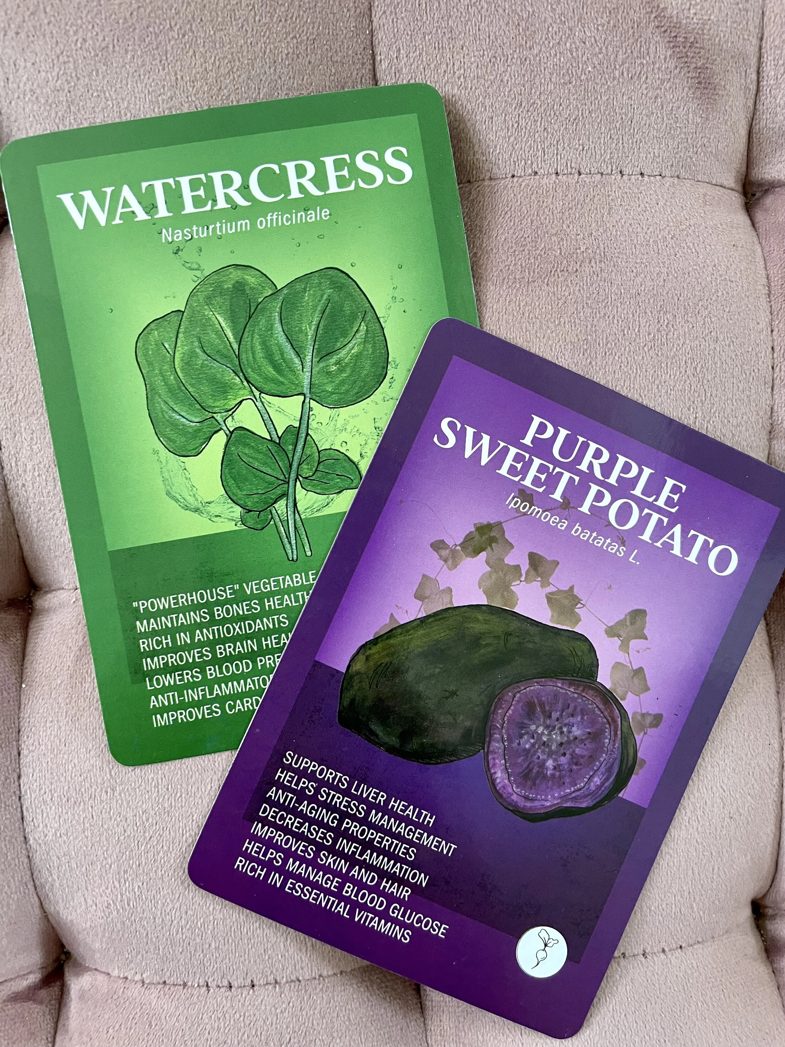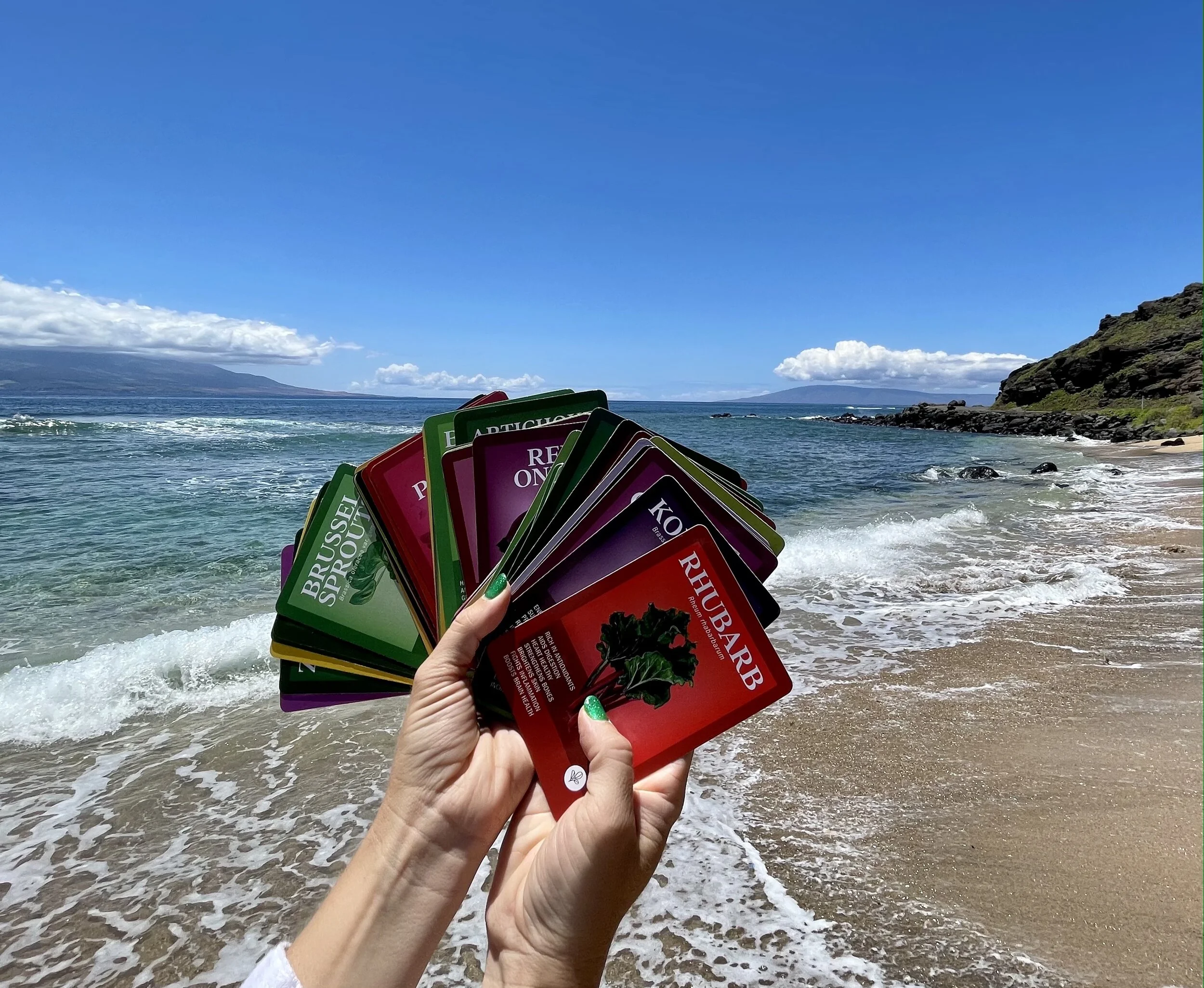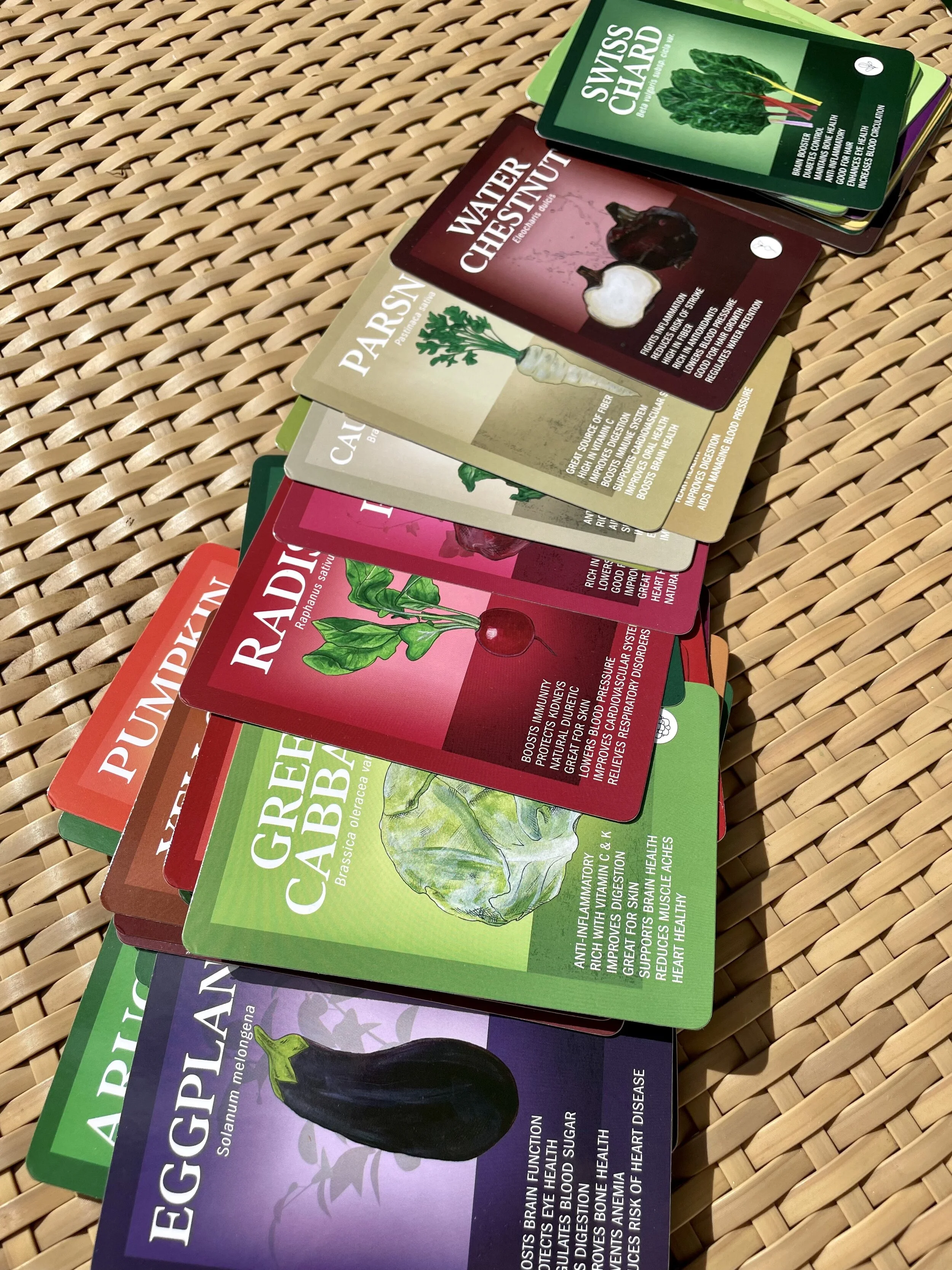 Each deck includes 5 suits of vegetables: from nightshades to leafy greens. Additionally, each card presents 7 health benefits maximizing knowledge and understanding of nutritional value.